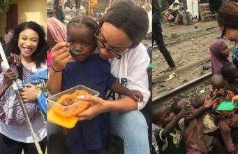 Tonto Dikeh feeds the less privileged, eats with them on the street (photos)