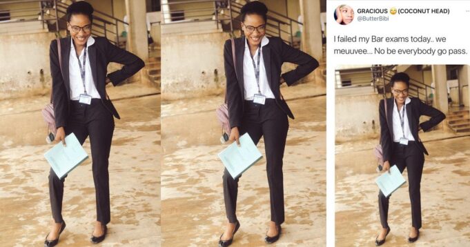 A Nigerian lady identified as @Butterbibi trended on social media after claiming she failed her final bar examinations.