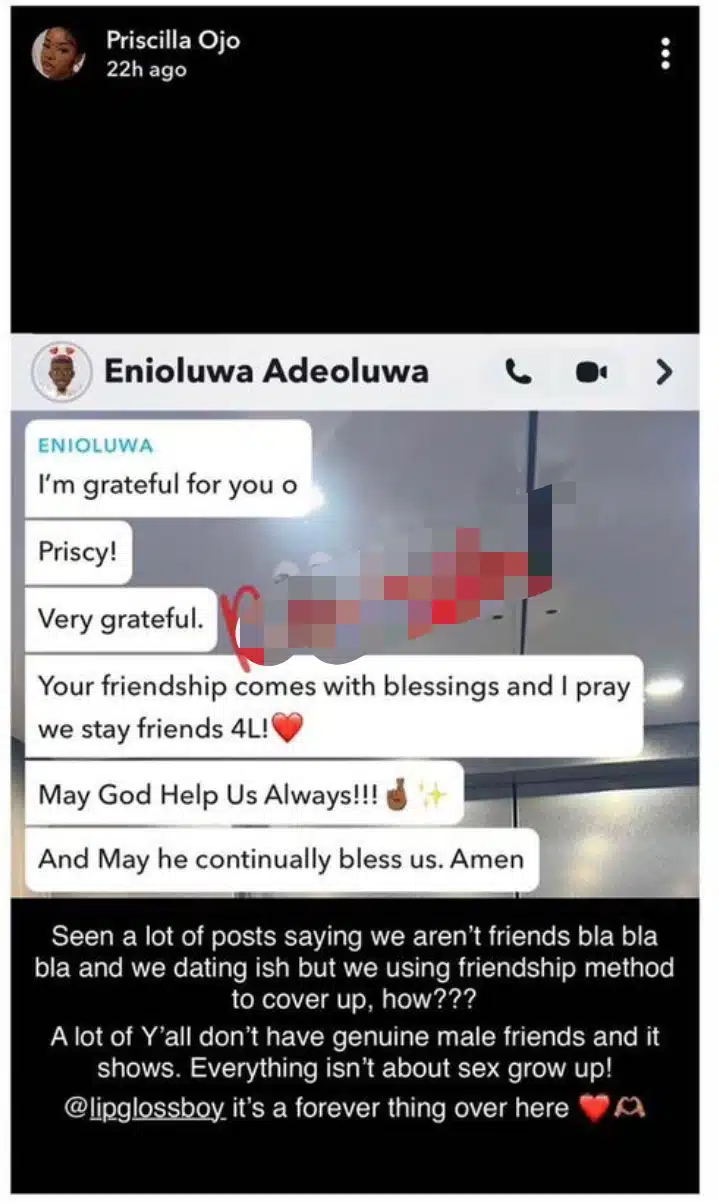 Sharing screenshots of the chat, Priscilla told those spreading rumors that she and Enioluwa are dating to grow up and understand that genuine male-female friendships exist without romantic involvement.