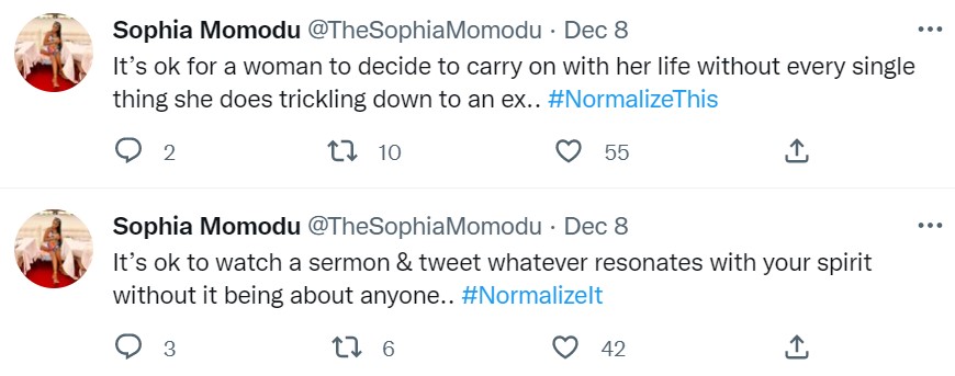 In a series of tweets she posted on Thursday, December 8, where she listed things that should be normalized in our society, Sophia told people to stop attributing everything a woman does or post on social media to a man she was associated with in the past.