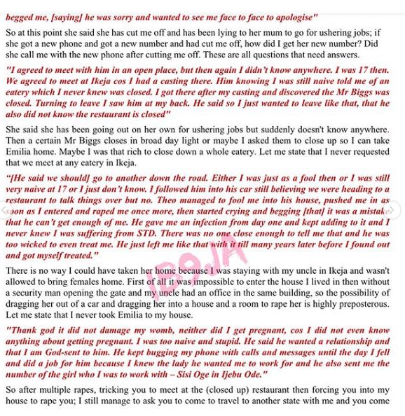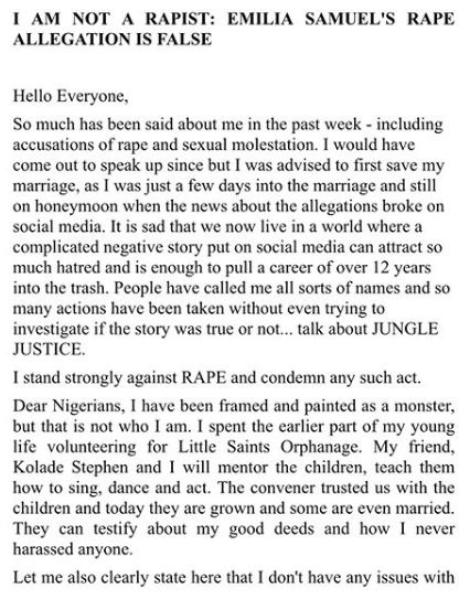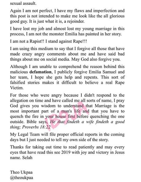In a lengthy note he penned to address the matter, Theo rubbished his accuser, Emilia Samuel’s claims, insisting that he is innocent and that he has been framed.