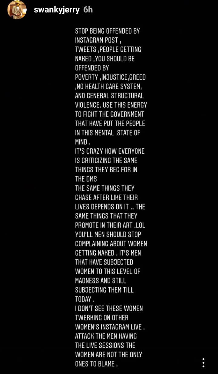 Savage also called out celebrity stylist, Swanky Jerry over his statement on the issue where he asked men to stop judging women who go naked on IG Live.