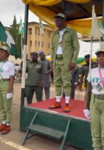 His Excellency had arrived at the camp for the official closing ceremony for the NYSC Batch “B” Stream 1 Orientation Course. He appeared kitted up in the NYSC khaki uniform, resembling a serving corp member.