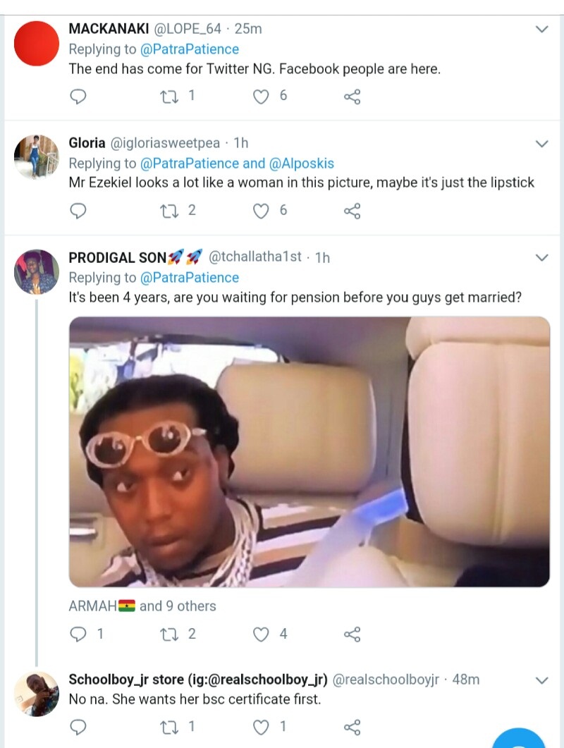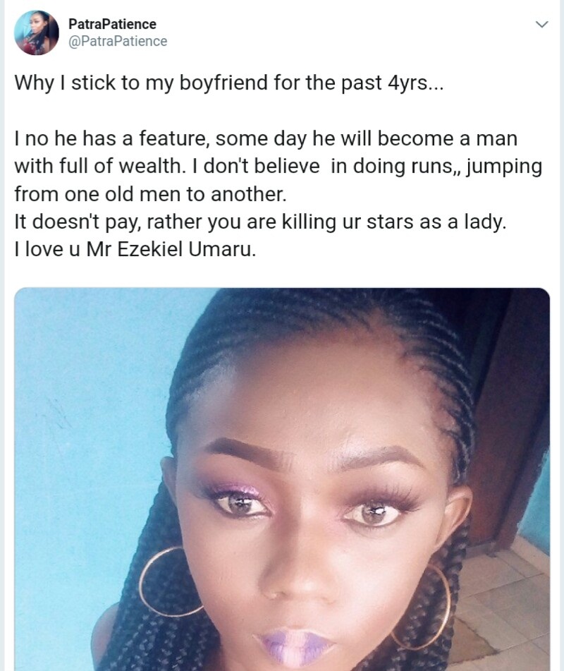 A Nigerian lady identified as @PatraPatience, took to her twitter page to explain the reasons behind having only one boyfriend in four years.