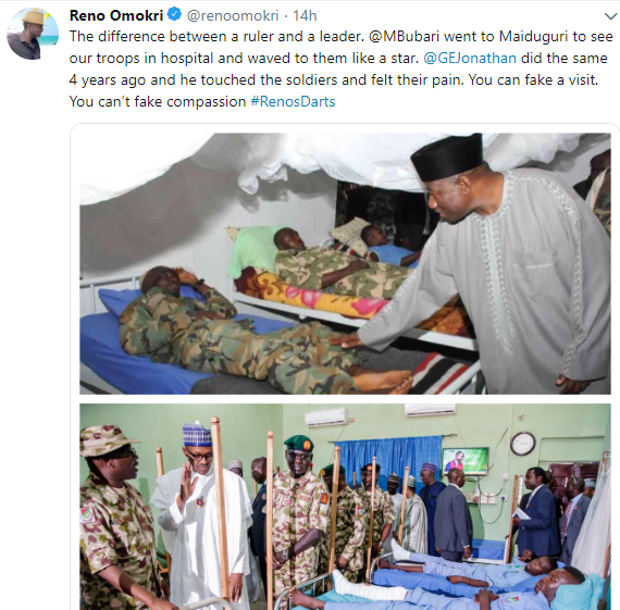 Reno Omokri has however taken to social media to compare President Buhari’s visit to that of ex-president Goodluck Jonathan’s visit to wounded soldiers during his regime.