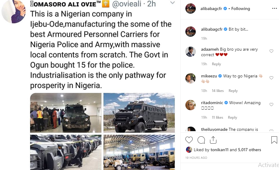 Alibaba and Falz took to their social media pages, to react to report of a Nigerian company based in Ijebu-Ode area of Ogun manufacturing armoured personnel carriers for Nigerian Police and Army with massive local contents from the scratch.