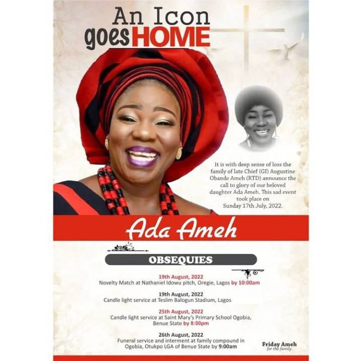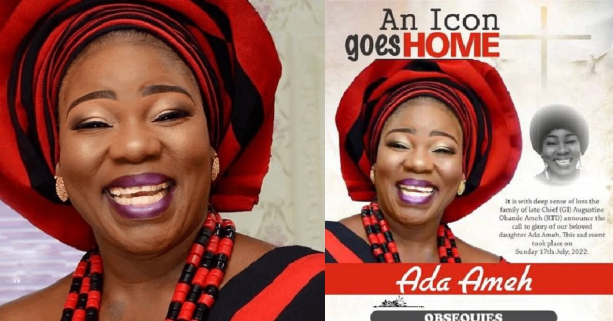 Ada Ameh passed away on Sunday, July 17, in Warri, Delta state.