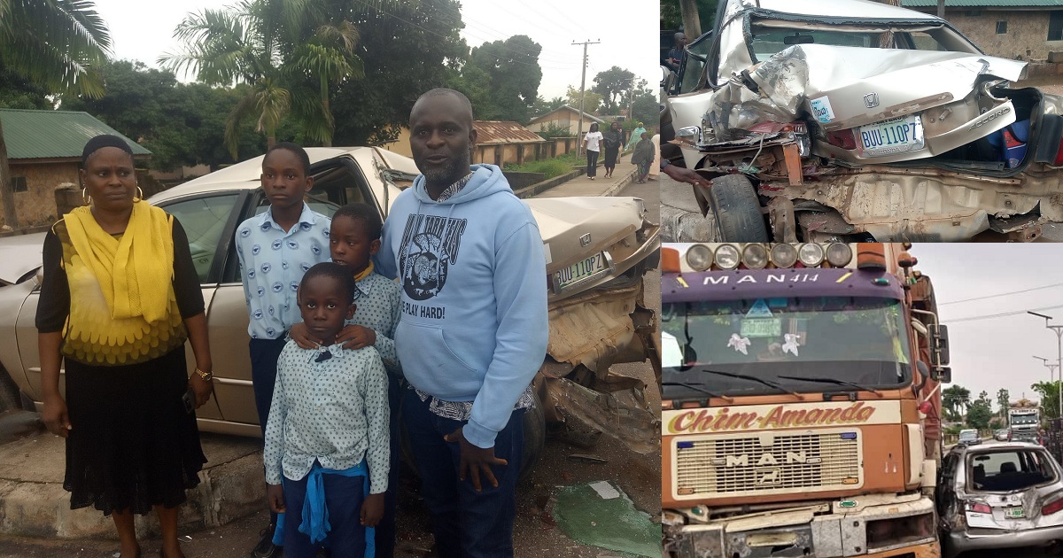 According to the pastor identified as Emmanuel Abu, who took to Facebook to recount how his family narrowly escaped death, they were all in their car when the trailer driving at top speed rammed into them on Monday evening.
