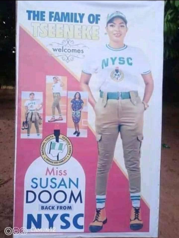 “The family of Tseeneke welcomes Miss Susan Doom back from NYSC.”