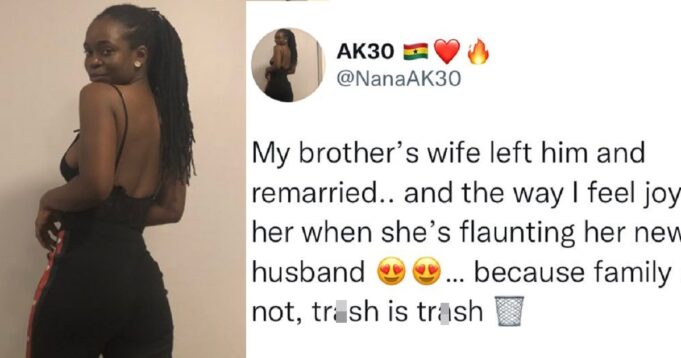 The lady identified as @NanaAK30 on the micro-blogging platform noted she feels joy when she sees her brother’s ex-wife flaunt her new husband.