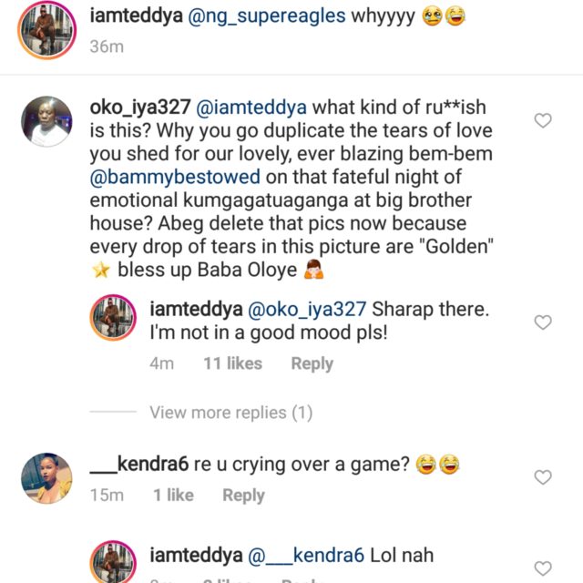 Teddy A was slammed by an obviously angry fan for sharing a photo on his Instagram page that depict his feelings following Super Eagles loss to Argentina.