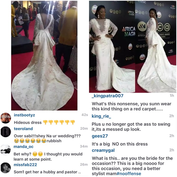 The Star actress has been called out by fans after she shared a peek of her choice of outfit to AMVCA last night on instagram. Some said her choice of outfit is a big NO! while others said she should get a hubby.