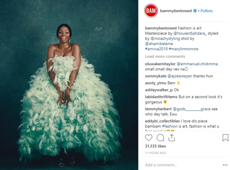 Big Brother Naija’s BamBam rocked the below outfit for the AMVCA 2018, and folks on social media have been calling her all sorts of names, from Hen, to chicken, to peacock.