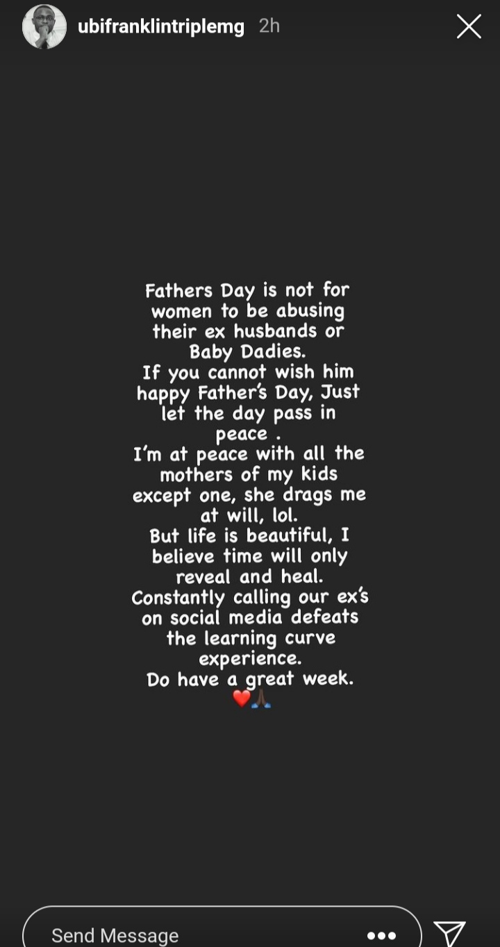 “Father’s day is not for women to be abusing their ex-husbands or Baby daddies. If you cannot wish him happy father’s day, just let the day pass in peace. I’m at peace with all the mothers of my kids except one, she drags me at will, lol.