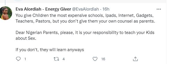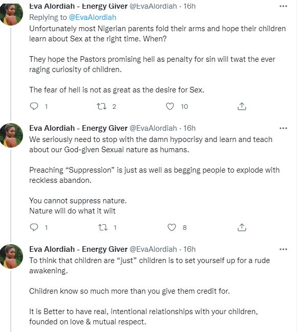 “Unfortunately most Nigerian parents fold their arms and hope their children learn about Sex at the right time. When? They hope the Pastors promising hell as penalty for sin will twat the ever raging curiosity of children. The fear of hell is not as great as the desire for Sex.” She wrote.
