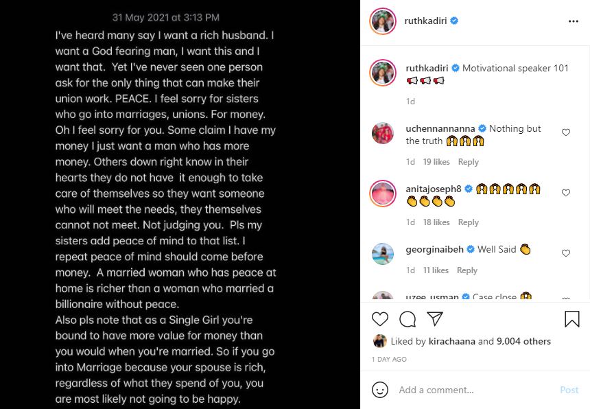 Popular actress, Ruth Kadiri has advised single ladies to choose peace of mind over money when choosing a spouse.