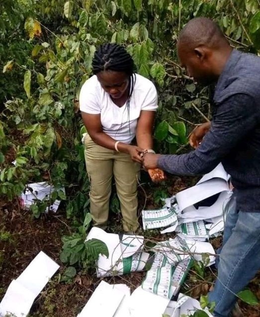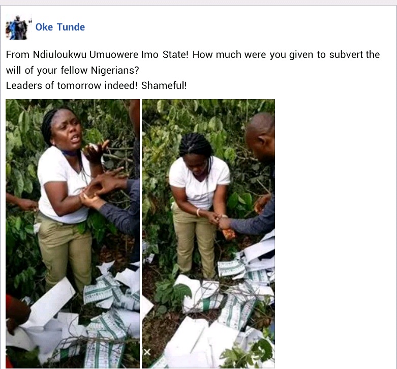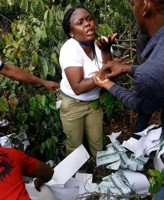 A female National Youth Service Corps member was reportedly caught destroying ballot papers in a bush in Imo State.