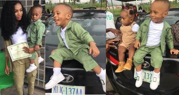 The lovely mama was pictured carrying her handsome child in a well-tailored NYSC khaki, white shirt and white sneakers to match.