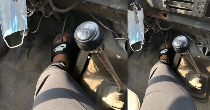 The lady shared a photo of her foot stepping on the brake of a commercial bus to keep it from moving after the driver left his bus to fight another road user.