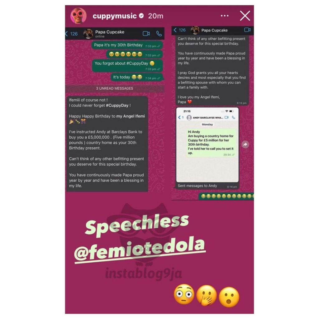 She also posted the chat she had with her billionaire father where he lauded her for being a great daughter and said he couldn’t think of a better present to gift her than a country home.