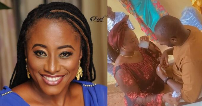 The lady, who is well-known for pushing feminism on Facebook, over the weekend shared a photo of herself kneeling for her spouse during their traditional wedding.