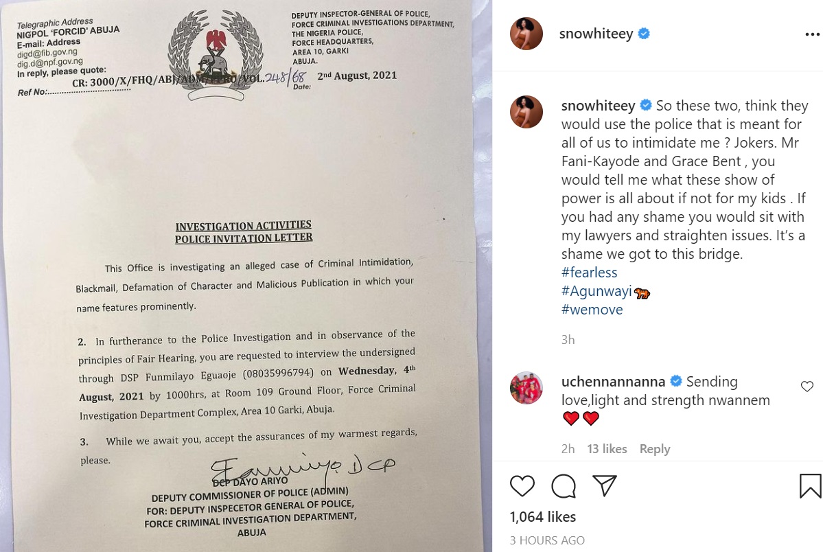 “So these two, think they would use the police that is meant for all of us to intimidate me ? Jokers. Mr Fani-Kayode and Grace Bent , you would tell me what these show of power is all about if not for my kids . If you had any shame you would sit with my lawyers and straighten issues. It’s a shame we got to this bridge.”
