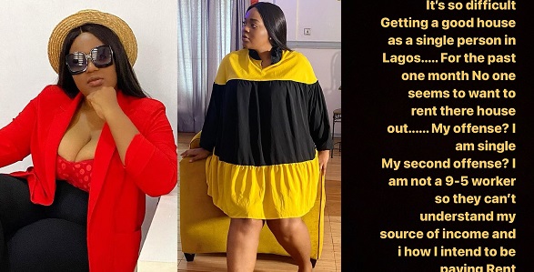 According to her Many Lagos Landlords have refused to lease their houses to her because she’s single and doesn’t have a 9-5 job.