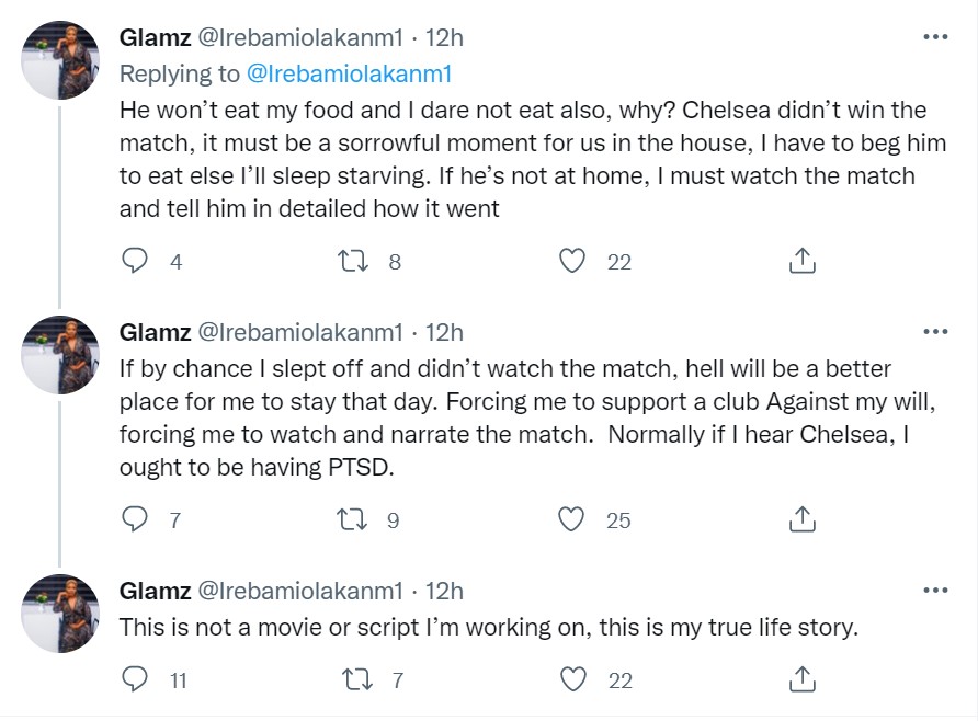 The single mum of one, who took to Twitter to open up about her domestic violence experience at the hands of her estranged boyfriend, narrated how he forced her to support his club, Chelsea FC, and became abusive whenever the team lost.