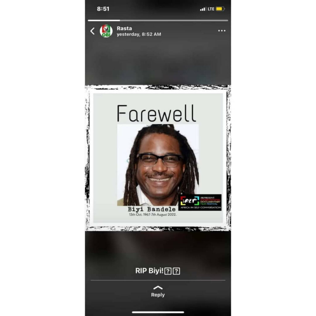 Bandele died in Lagos on Sunday, August 7, 2022 at the age of 54, the family said in a statement on Tuesday morning, August 9.