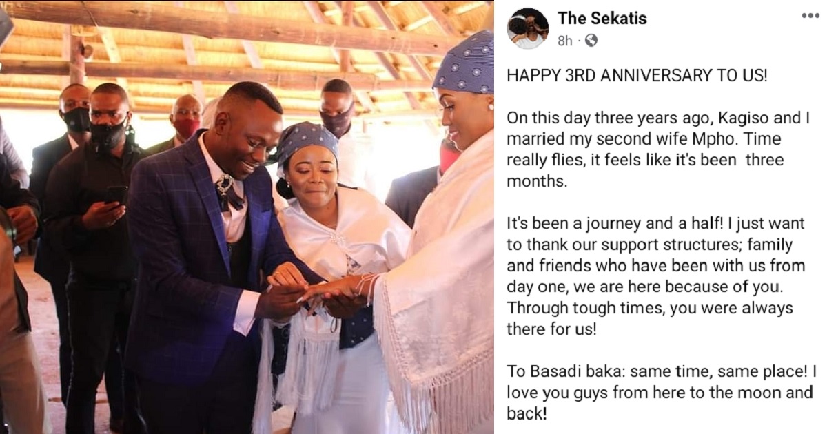 “HAPPY 3RD ANNIVERSARY TO US! On this day three years ago, Kagiso and I married my second wife Mpho,” he wrote.