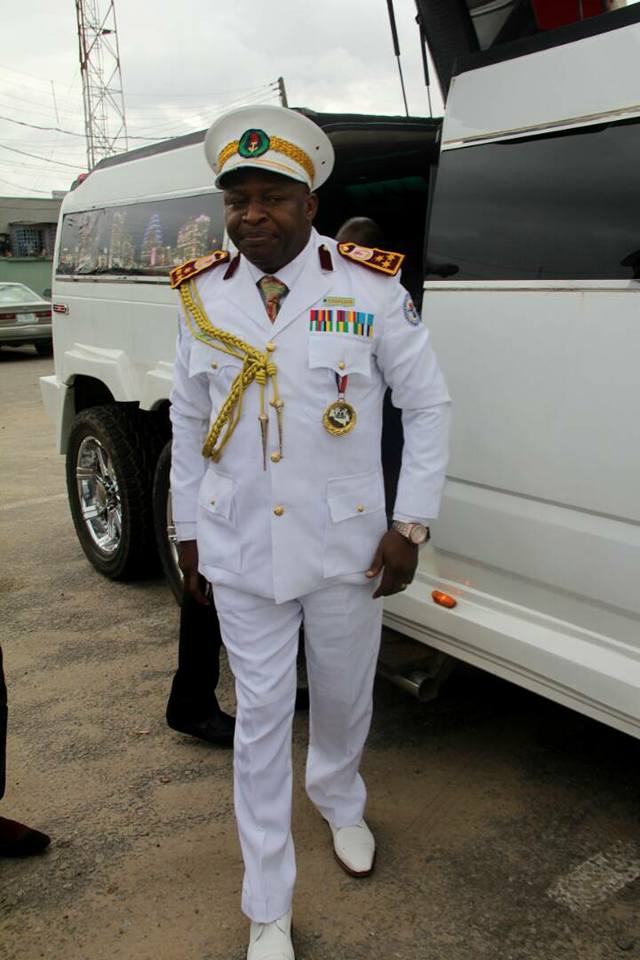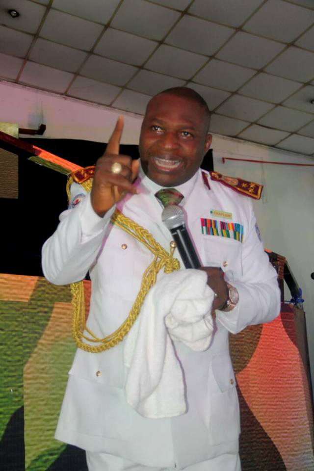 The General Overseer of Christ Royal Family International Church, Bishop Tom Samson, who recently acquired a stretch limousine SUV which is said to be worth about N80million, wore this military outfit to church yesterday.