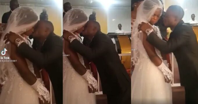 The groom tried severally to kiss his bride amid cheers from the guests but she refused. As the bride, who had on a gloomy look, kept removing her face to dodge the kiss from her husband, he planted the kiss on her cheek.