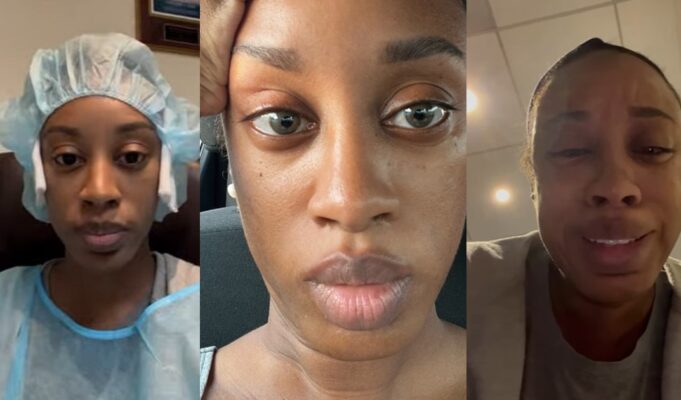 “What happened to contact lens?” – Lady brǝaks down in tǝars after a fa!led eye colour change surgery (VIDEO)