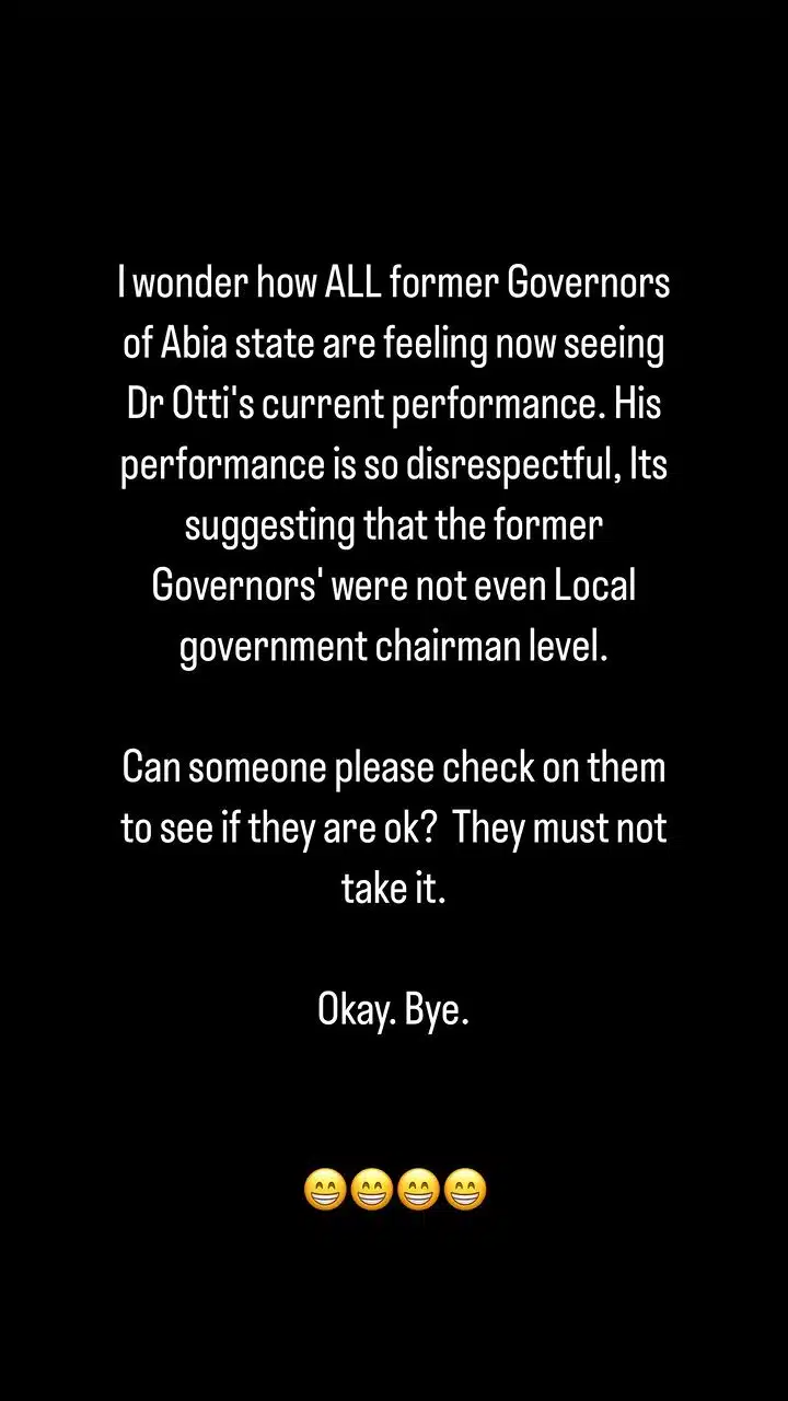 “I wonder how ALL former Governors of Abia state are feeling now seeing Dr Otti’s current performance. His performance is so disrespectful, Its suggesting that the former Governors’ were not even Local government chairman level. Can someone please check on them to see if they are ok? They must not