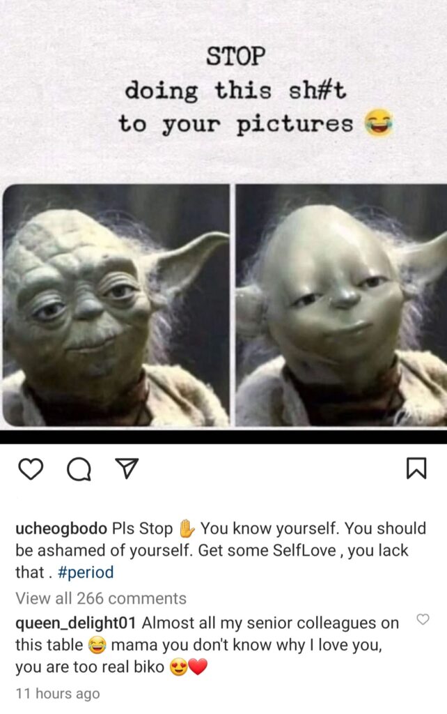 Moments later, Uche shared side-by-side photos of the Star Wars character Baby Yoda. One showed Baby Yoda with a rough face, while the other showed an edited version with a smoother appearance.