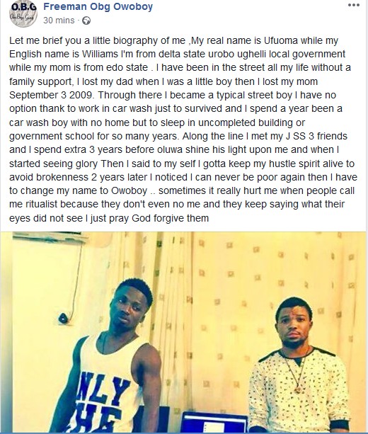 Let me brief you a little biography of me ,My real name is Ufuoma while my English name is Williams I’m from Delta state, urobo ughelli local government while my mom is from edo state . I have been in the street all my life without a family support, I lost my dad when I was a little boy then I lost my mom September 3 2009.