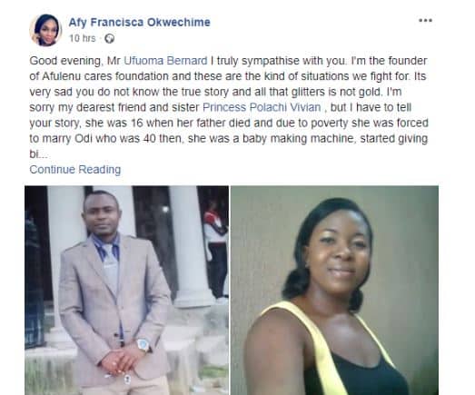 Good evening, Mr Ufuoma Bernard I truly sympathise with you. I’m the founder of Afulenu cares foundation and these are the kind of situations we fight for. Its very sad you do not know the true story and all that glitters is not gold. I’m sorry my dearest friend and sister Princess Polachi Vivian , but I have to tell your story, she was 16 when her father died and due to poverty she was forced to marry Odi who was 40 then, she was a baby making machine, started giving birth from 17, Odi would only sleep with her for procreation and never showed her intimacy, he beat her up to stupor some nights she didn’t agree, she suffered from depression which led to her weight gain, she was unhappy and had no one to turn to until she registered herself at the stadium not a gym and not by Odi.