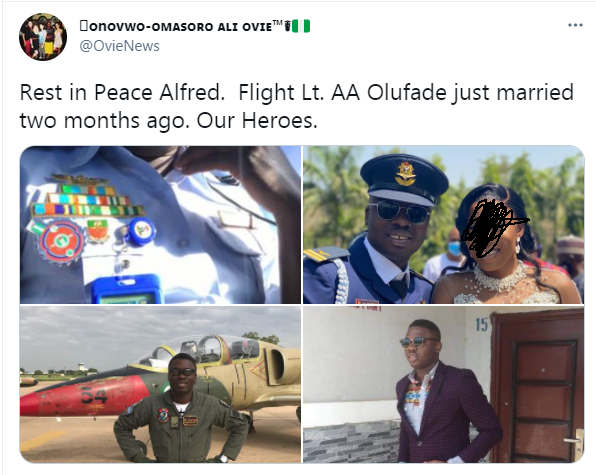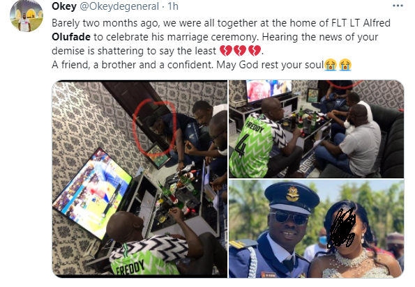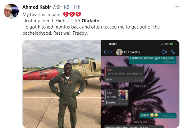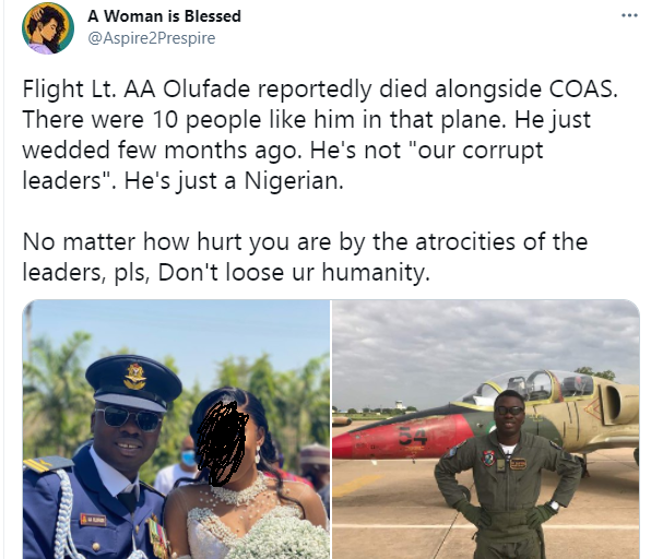 Friends and colleagues have taken to their respective social media pages to mourn the demise of Nigerian Air Force Pilot, Lt. AA Olufade who died in a plane crash with the Chief of Army Staff, Ibrahim Attahiru and 9 others.