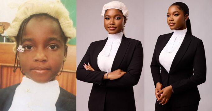 A lady, Aanu Austine-Orimoloye, has warmed hearts online after celebrating her call to the bar by recreating a childhood photo of herself dressed in a legal wig and gown.