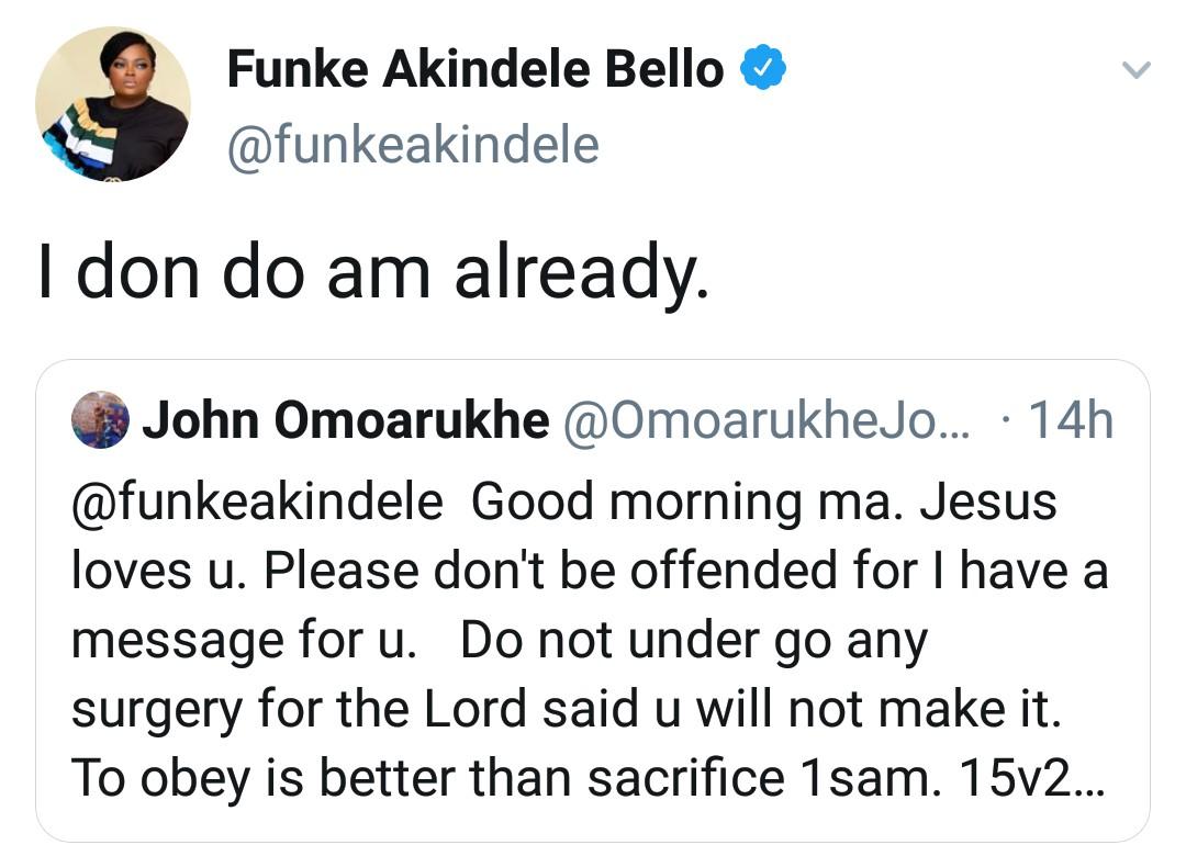“@funkeakindele Good morning ma. Jesus loves u. Please don’t be offended for I have a message for u. Do not under go any surgery for the Lord said u will not make it. To obey is better than sacrifice 1sam. 15v22 and Jer. 7v23. God bless u as u obey. Thanks”.