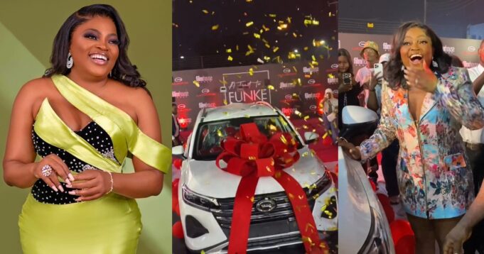 Popular Nollywood actress Funke Akindele was recently surprised with a brand-new SUV in celebration of the success of her movie ‘A Tribe Called Judah’.