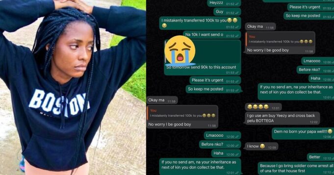 The social media influencer identified as Omotara Akanni, shared screenshots of their chat on micro-blogging platform, Twitter, and explained that she wanted to transfer N10,000 to her brother but mistakenly added an extra zero (0), so she unknowingly sent him N100,000.