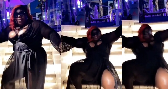 Badmus, who shot to limelight after starring in Funke Akindele’s ‘Jenifa’s Diary’, was walking down a staircase and showing off her voluptuous body which was covered in a beautiful black gown.