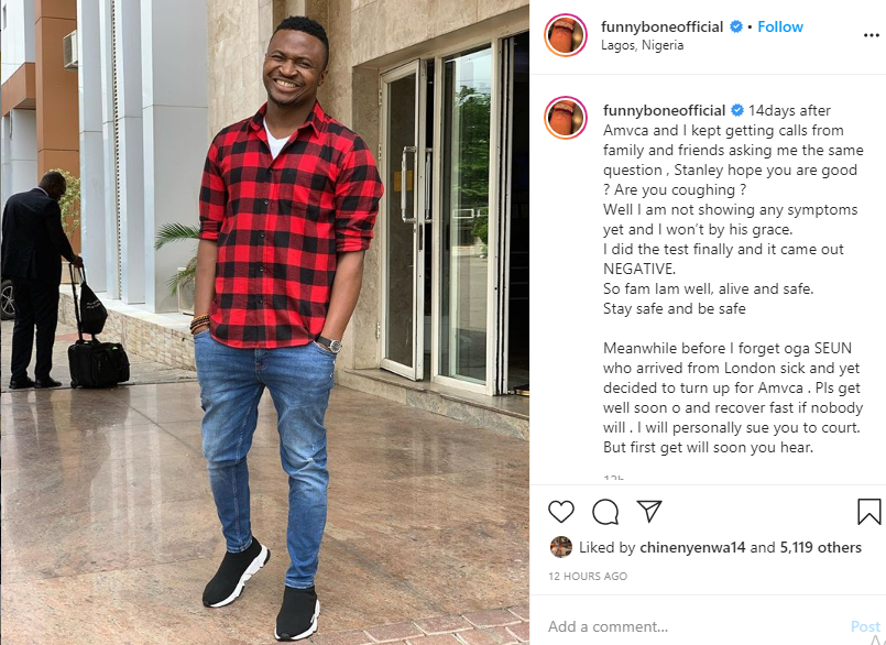 Funnybone has however revealed his plans of suing Seun who arrived from London sick and yet decided to attend the AMVCA. The comedian who revealed that he tested negative for the virus, added that he keeps getting calls from family and friends even though the event was held over 14 days ago.