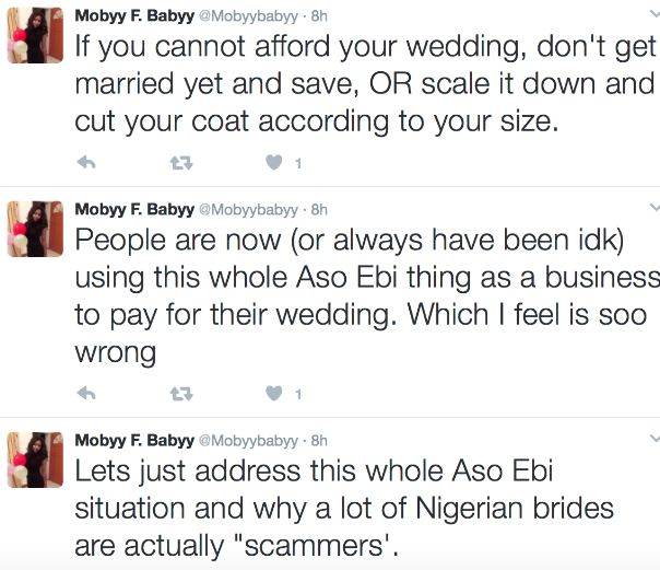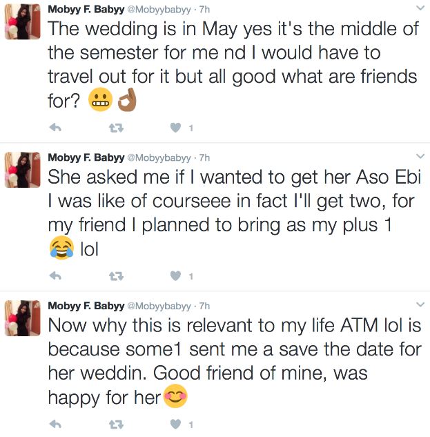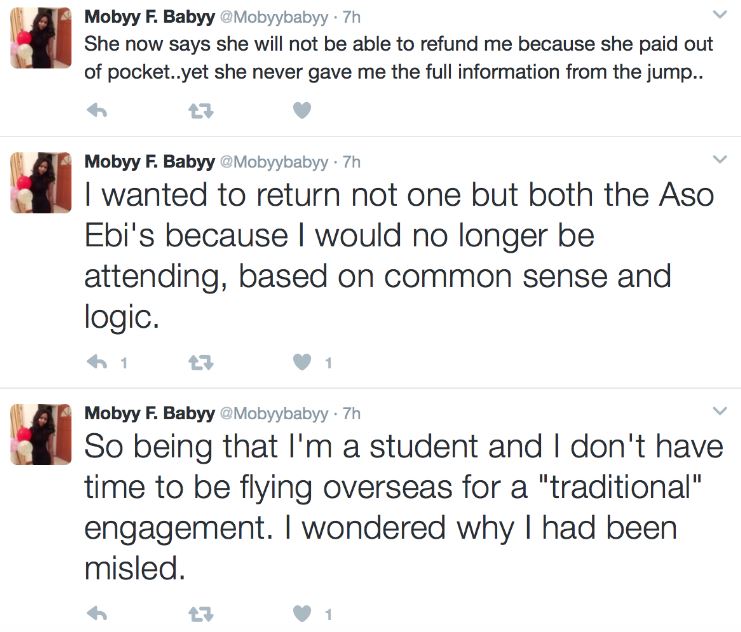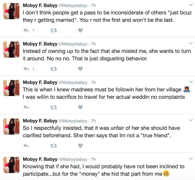 However, Mobyy later found out it was just the traditional wedding and she didn’t think it was worth attending anymore – So she asked her girlfriend for a refund of the Aso-ebi money only to be dealt with a shocker, girlfriend refused refunding her and Mobyy is pissed she was used to fund a wedding.