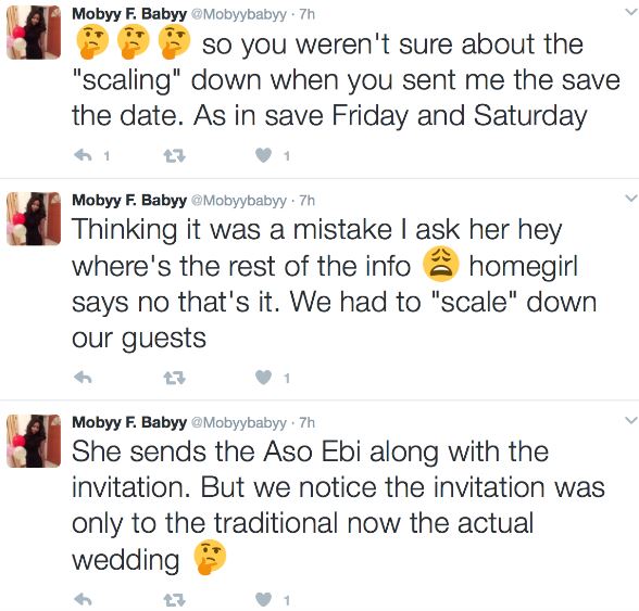 According to Mobyy, her girl “conned” her into buying her wedding Aso-ebi by making her believe she was invited to both her traditional and white wedding ceremonies.