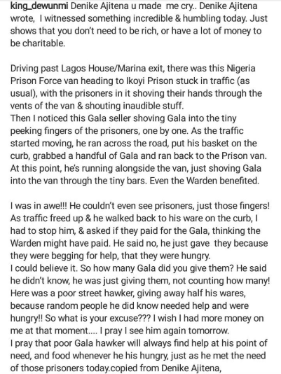 As usual, the prisoners stretched out their hands through the tiny holes by the sides of the van and the Gala seller’s next action surprised everyone.