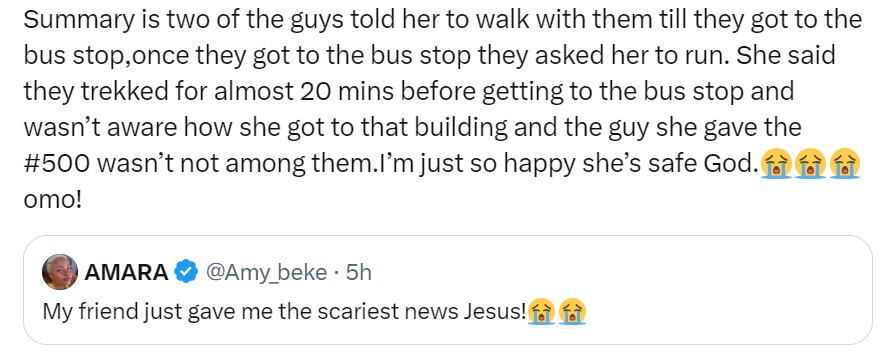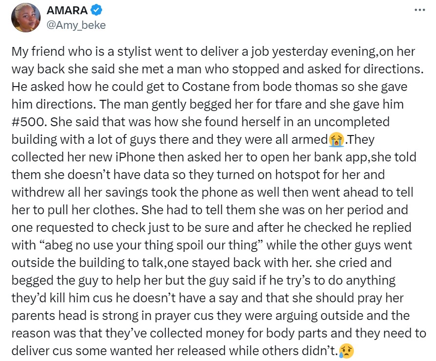 My friend who is a stylist went to deliver a job yesterday evening, on her way back she said she met a man who stopped and asked for directions. He asked how he could get to Costane from Bode Thomas so she gave him directions. The man gently begged her for fare and she gave him #500. She said that was how she found herself in an uncompleted building with a lot of guys there and they were all armed. They collected her new iPhone then asked her to open her bank app, she told them she doesn’t have data so they turned on hotspot for her and withdrew all her savings took the phone as well then went ahead to tell her to pull her clothes. She had to tell them she was on her period and one requested to check just to be sure and after he checked he replied with “Abeg no use your thing spoil our thing” While the other guys went outside the building to talk, one stayed back with her. she cried and begged the guy to help her but the guy said if he try’s to do anything they’d kill him cus he doesn’t have a say and that she should pray her parents head is strong in prayer cus they were arguing outside and the reason was that they’ve collected money for body parts and they need to deliver cus some wanted her released while others didn’t. In summary is two of the guys told her to walk with them till they got to the bus stop, once they got to the bus stop they asked her to run. She said they trekked for almost 20 mins before getting to the bus stop and wasn’t aware how she got to that building and the guy she gave the #500 wasn’t not among them. I’m just so happy she’s safe God. omo!