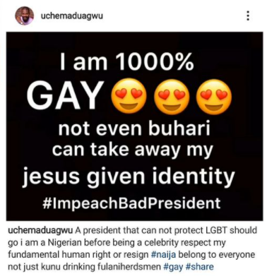 Controversial Nollywood actor, Uche Maduagwu has again taken to social media to reveal he’s gay barely a month after denouncing his sexuality as a gay man.