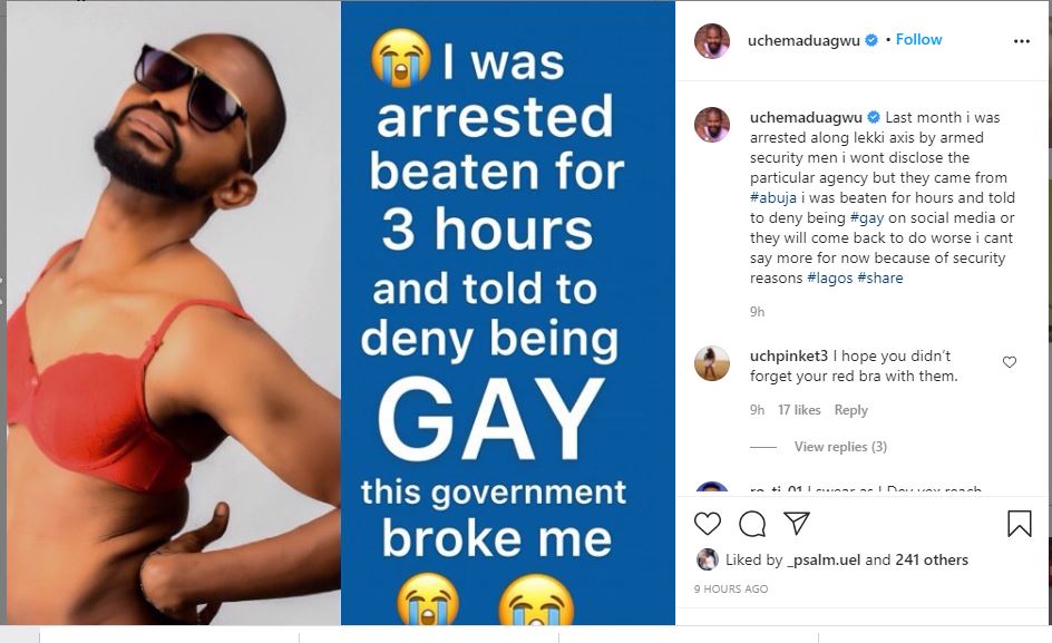 “Last month i was arrested along lekki axis by armed security men i wont disclose the particular agency but they came from #abuja i was beaten for hours and told to deny being #gay on social media or they will come back to do worse i cant say more for now because of security reasons”.